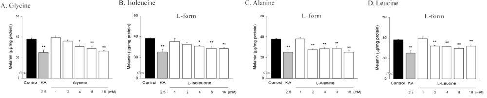 ① 4가지 활성 아미노산 성분(Alanine, Glycine, Isoleucine, Leucine)이 '멜라닌 생합성'을 감소 시킵니다.